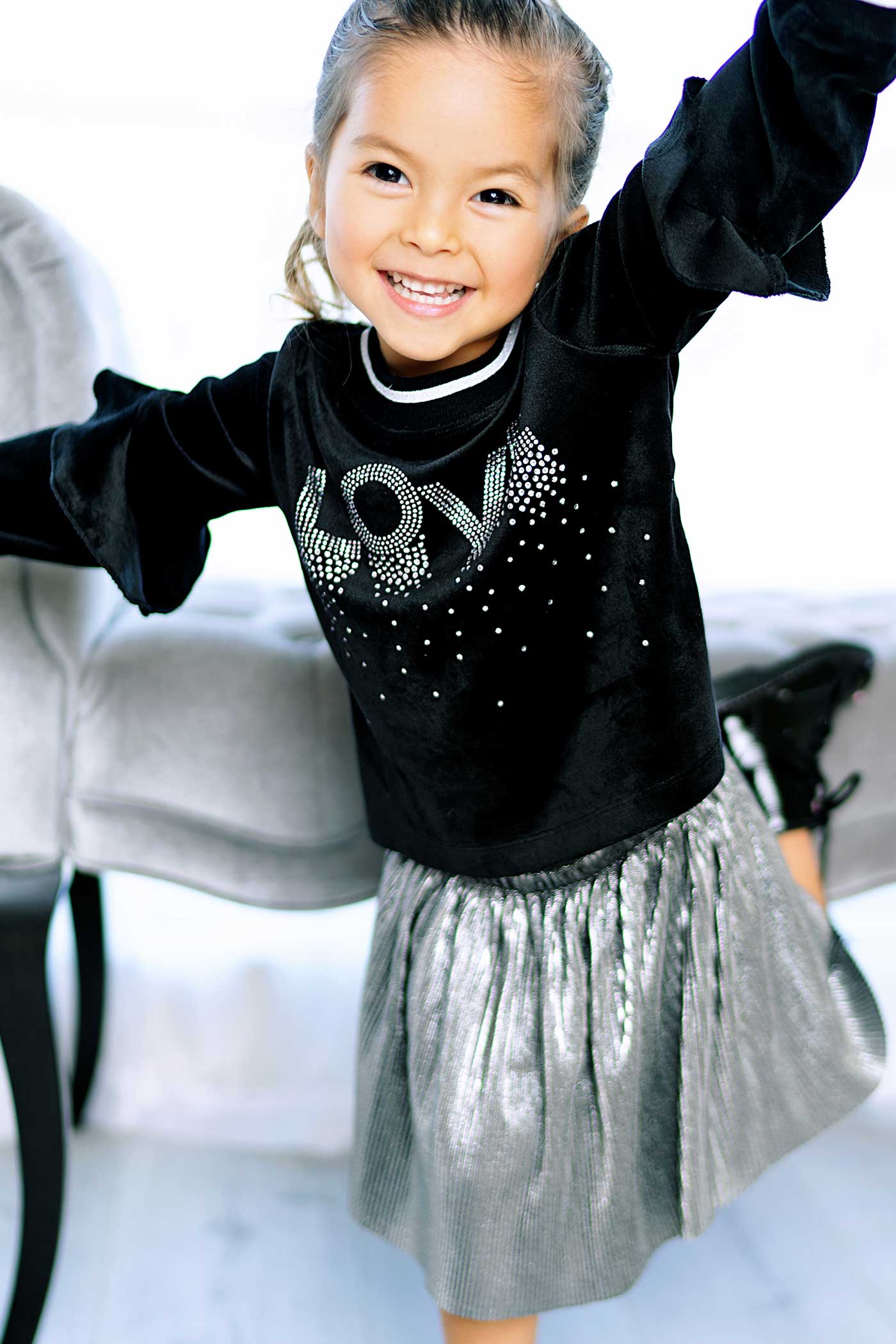 This adorable baby girl’s velour shirt features playful double-tiered ruffles and sparkling rhinestone "Love" text that adds a touch of magic. The ribbed and striped crewneck and cuffs provide cozy comfort, while the relaxed fit ensures easy movement for your little one’s busy day. Perfect for adding charm and comfort to any outfit!