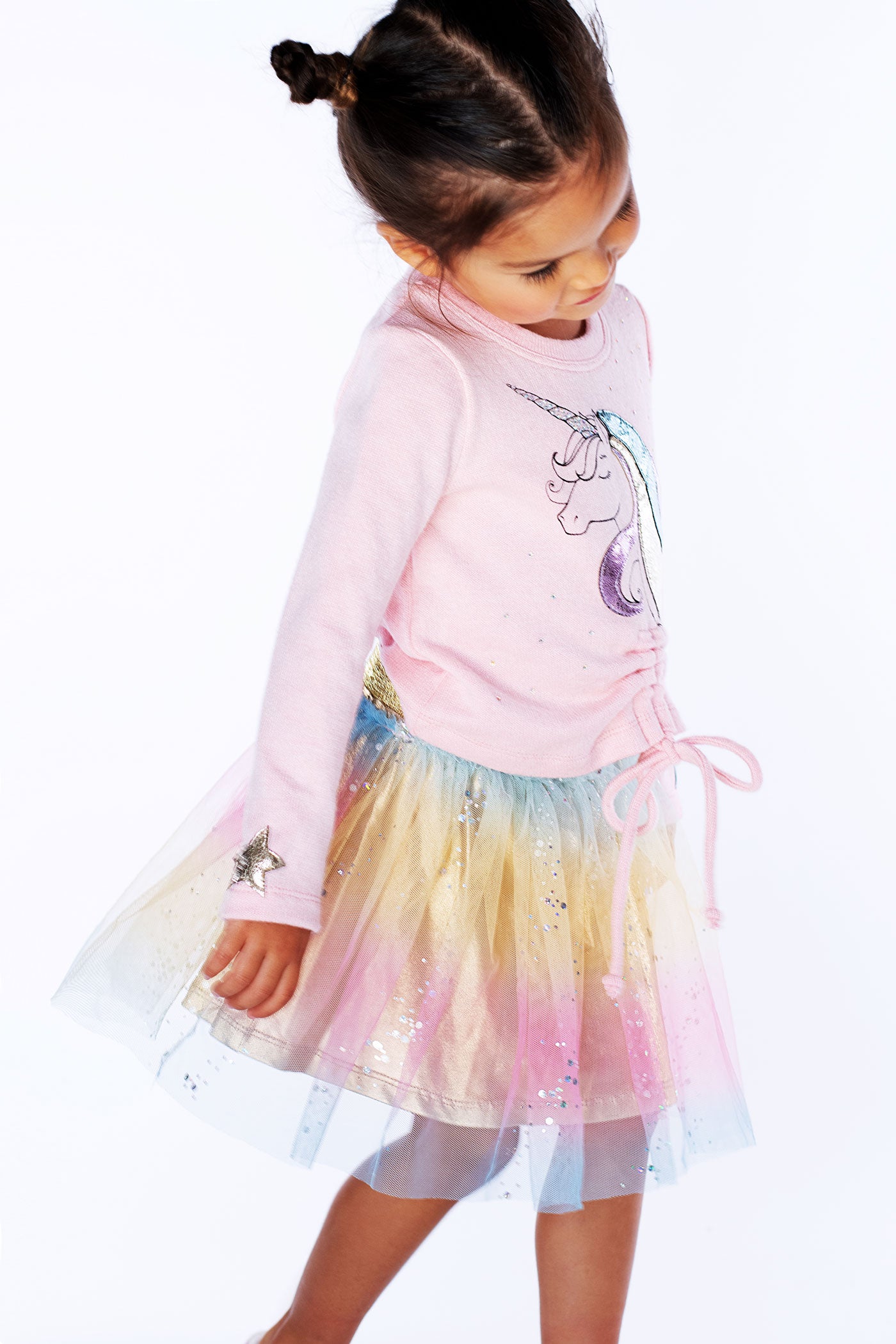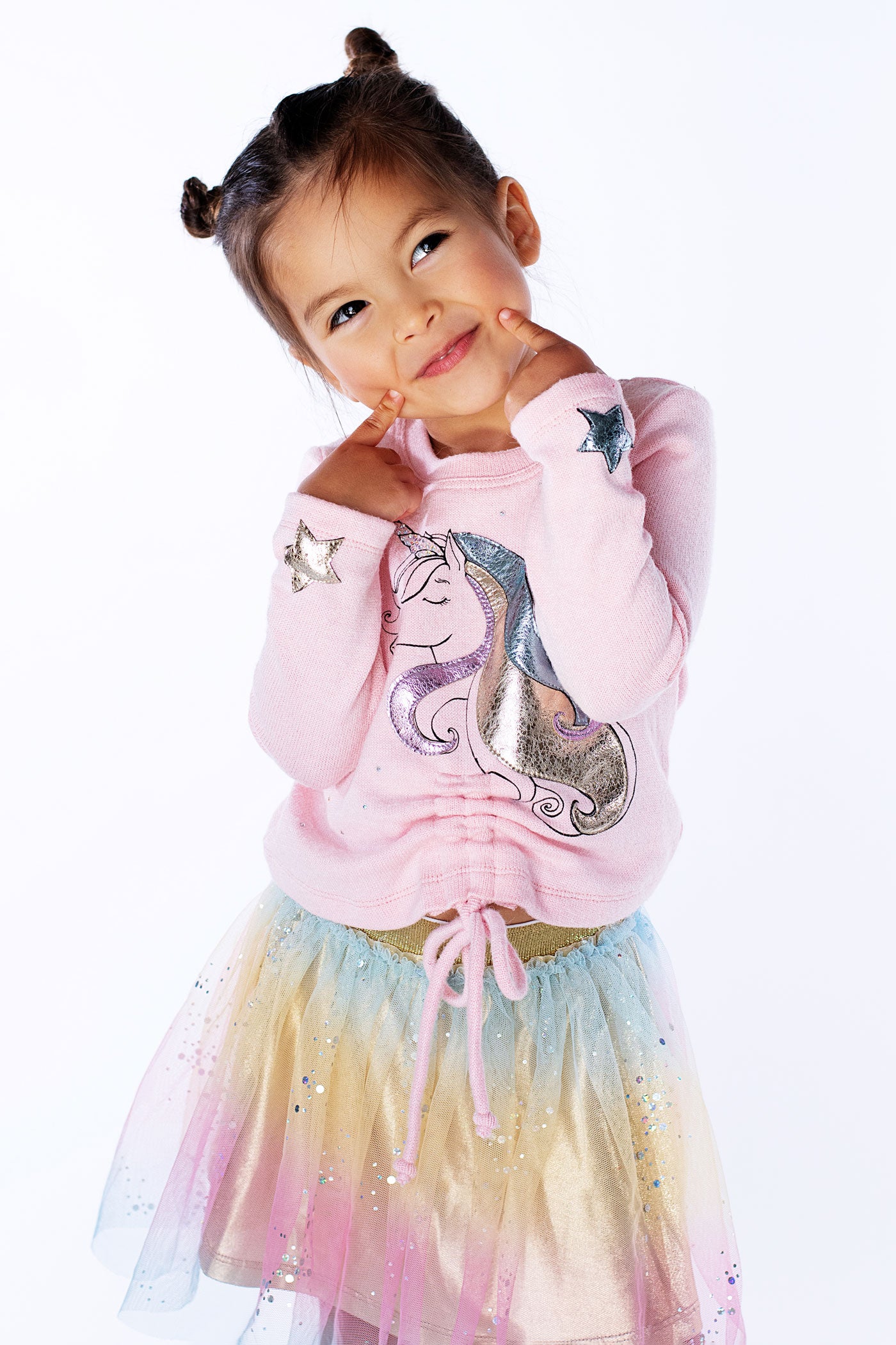 Brighten her day with the Baby Girl's Unicorn Stars Ruched Top! This playful top features a large unicorn adorned with shiny pleather details and sparkling rhinestones for a subtle touch of magic. The ruched front with a drawstring adds a fun, adjustable fit, while silver star patches on the long sleeves bring extra charm. With a comfy round neckline and imported quality, it’s perfect for little dreamers who love a bit of sparkle and whimsy.