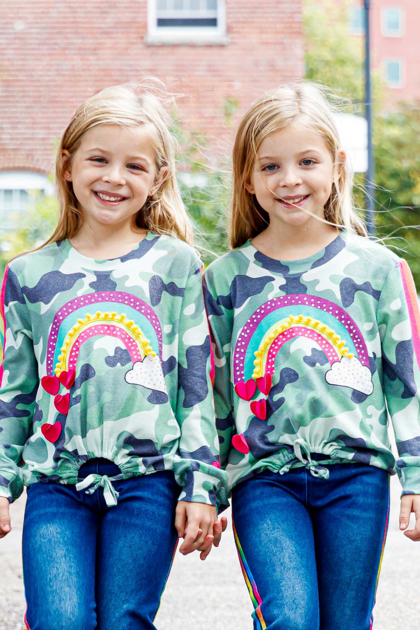 This long sleeve camo top for little girls features a fun round neckline and easy pullover design for comfortable wear. The playful camouflage print is brightened with colorful rainbows, red 3D hearts, and sparkling rhinestone cloud accents. A vibrant sport band and graphic details add extra charm, while the cute tie-front hem gives it a trendy finish. Perfect for adding a splash of color and whimsy to any casual outfit. Imported for quality and style.