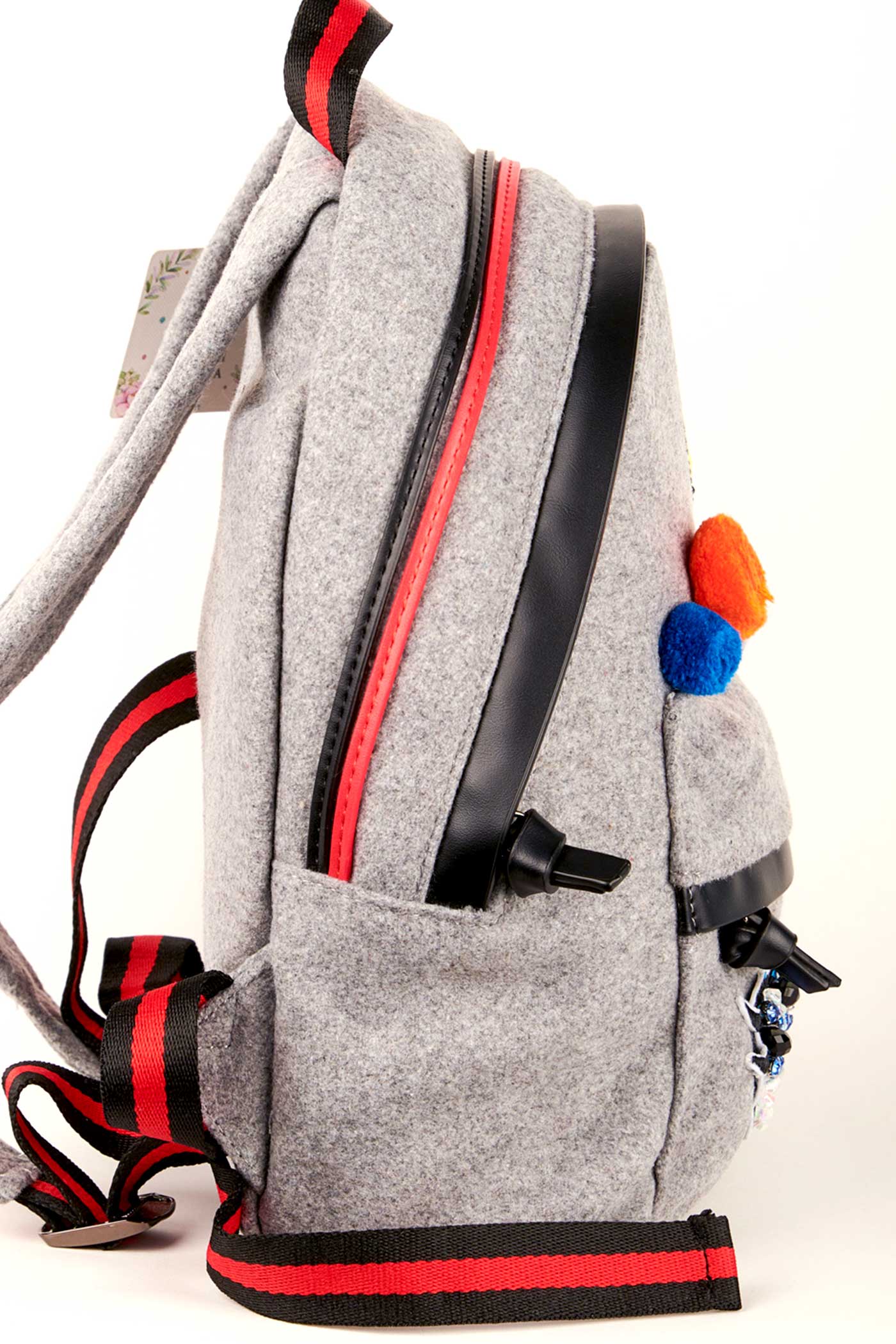 This Playful Patch Backpack is crafted from casual, fun felt fabric and features a top zipper closure for easy access. Adorned with a smiley face, googly eyes, a jeweled bolt, and a vibrant pom-pom, it bursts with personality. The contrast sport band adds a sporty touch, while the fully lined interior and inside zipper pocket keep belongings organized. Measuring 14" H x 12" W x 5" D, it’s perfect for playful adventures.
