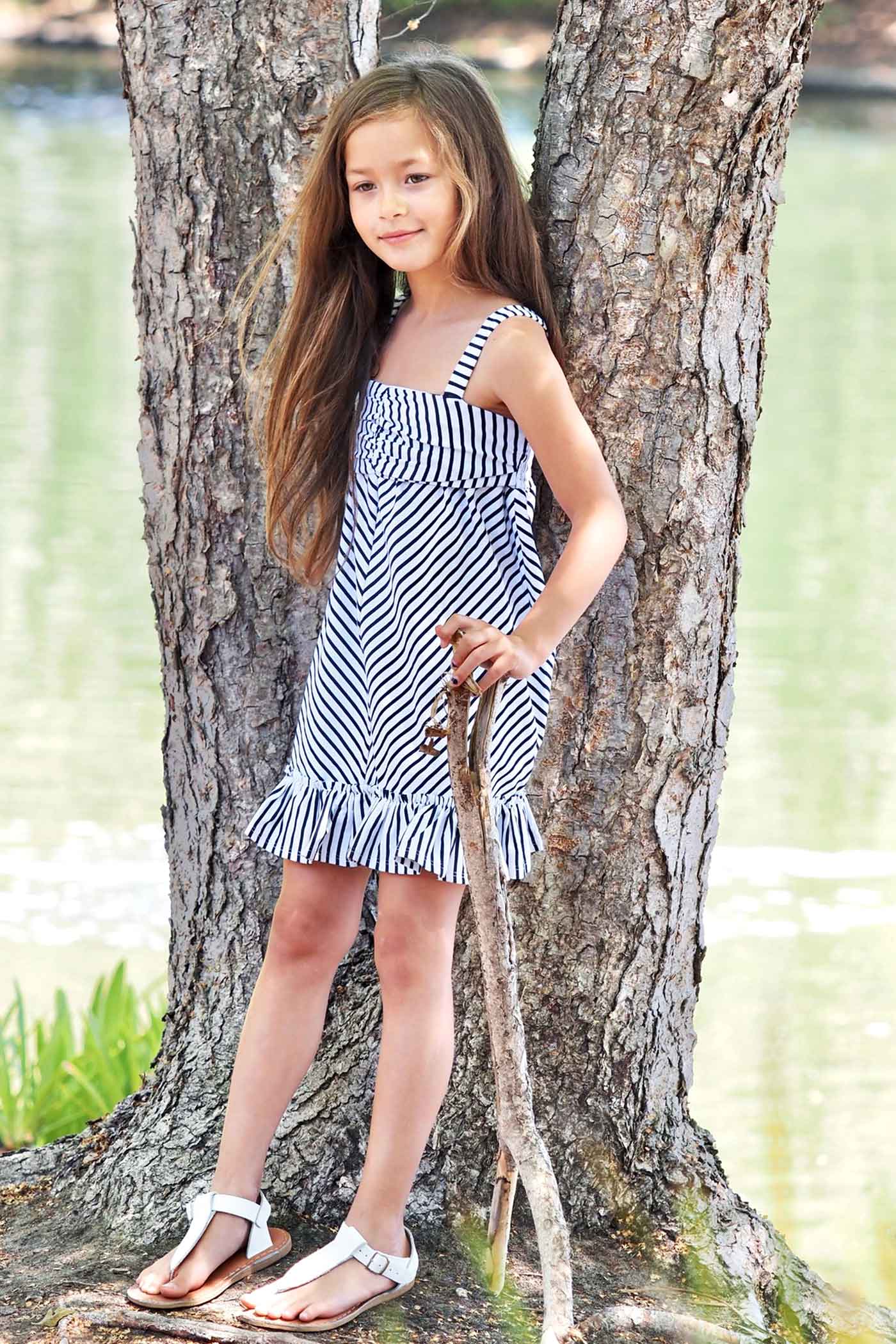 This Little Girls Sleeveless Striped Ruffle Sundress is made from soft, comfy knit fabric that’s perfect for sunny days. The cute shirred top adds a fun touch, while the playful ruffle hem brings extra twirl power. Featuring classic black and white stripes and a breezy length right above the knee, it’s an easy choice for summer adventures and playdates. Imported and ready for endless fun!