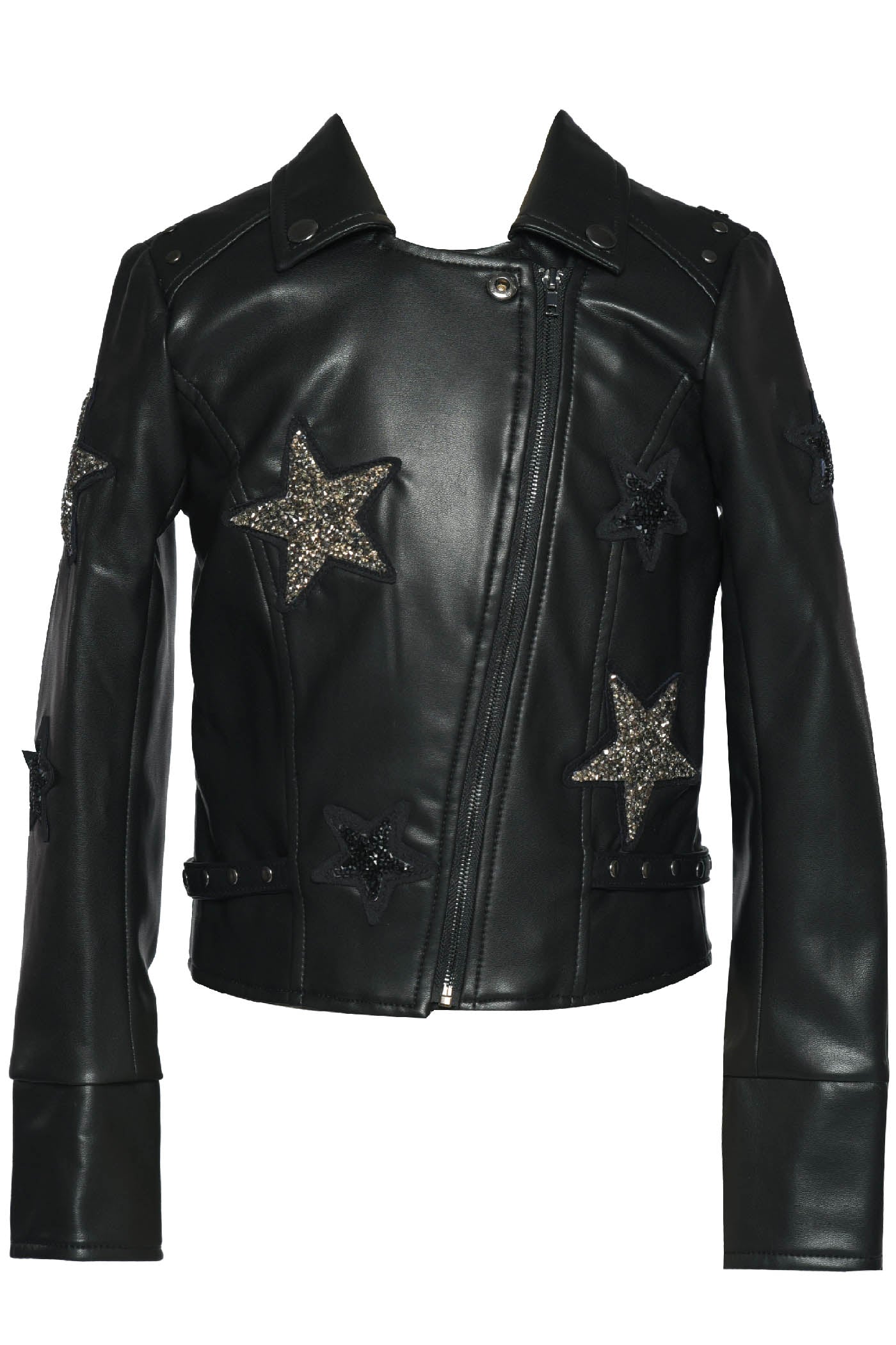 Edgy meets sparkle in this faux leather moto jacket designed for girls who love attitude with a touch of glam. Featuring eye-catching rhinestone star embellishments across the front, it's the perfect statement piece for elevating any outfit. The classic moto silhouette delivers that cool-girl vibe, while the soft faux leather keeps it comfortable for all-day wear. Whether she's heading to school or a special event, this jacket adds instant personality and style.
