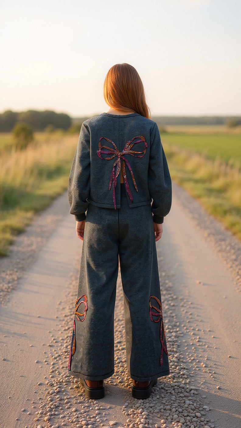 Rock these charcoal knit pants and let the sequin bow steal the show! Side leg slits bring an edgy vibe while the plush knit keeps you wrapped in comfort. Mix-and-match magic happens when you pair them with our matching sweatshirt (sold separately)—both feature that signature sequin bow for a coordinated ensemble that's totally you. Whether you're lounging or stepping out, these pants deliver style without the fuss.