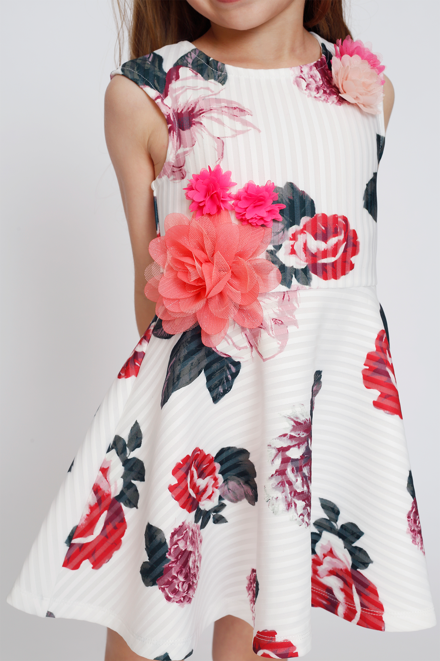 This playful summer skater dress features a round neckline and classic cap sleeves for a timeless look. The fit and flare silhouette flatters every shape, while the gorgeous floral print brings vibrant, sunny vibes. Adorned with an adorable 3-D flower detail, it adds a fun, whimsical touch. Falling right above the knee, it’s perfect for twirling through warm days. Imported and ready to brighten any wardrobe!