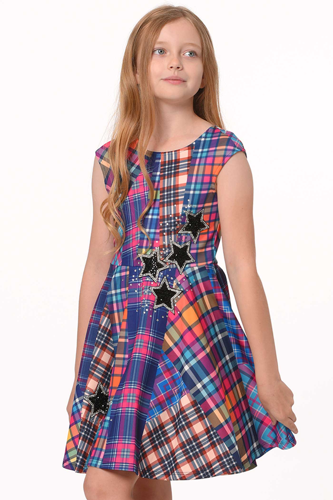 Mixed plaid skater dress with sparkling star appliques and rhinestone embellishment, a piece good for both casual daily wear and parties.