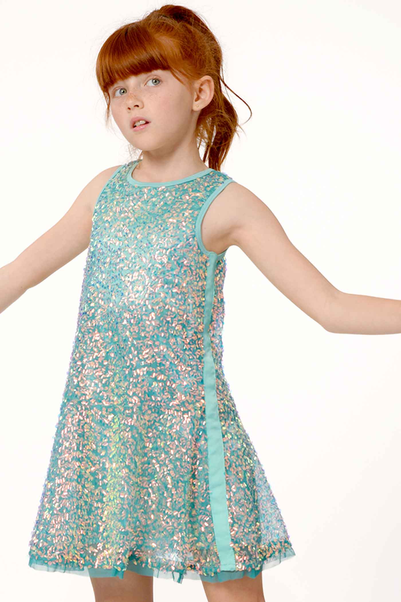 - Classic dropped waist, sleeveless A-line dress design