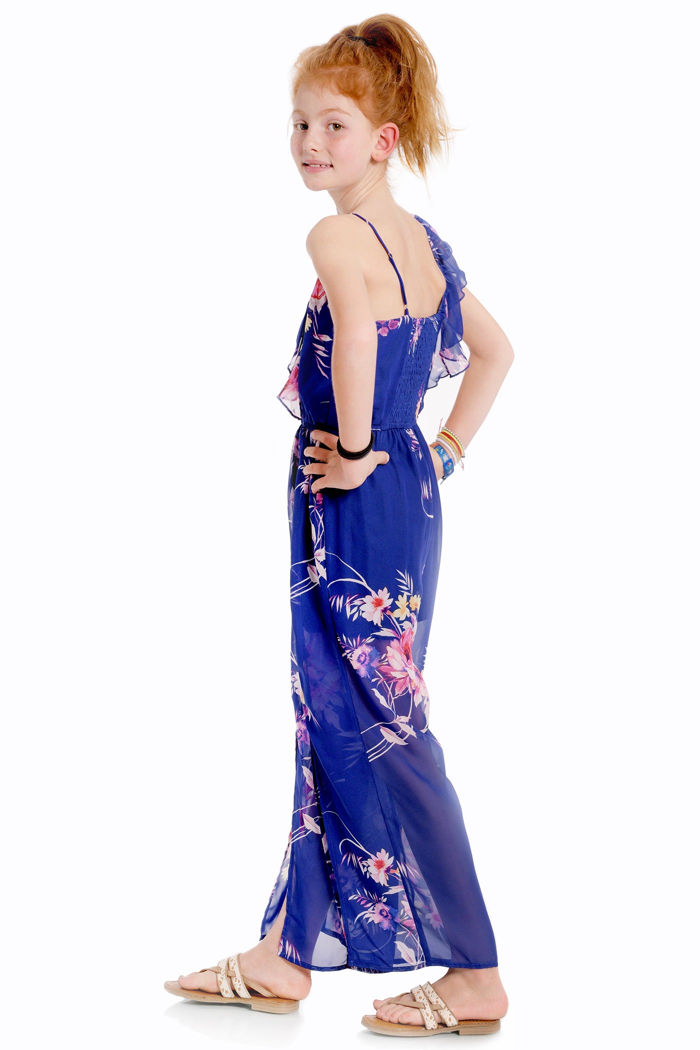 This playful jumpsuit features a vibrant floral print perfect for spring and summer fun. The stylish asymmetrical ruffled top adds a flirty touch, while the eye-catching slit leg design keeps it fresh and breezy. Made from flowy chiffon with a comfortable lining, it’s an easy choice for twirls and adventures all day long. Imported for quality and style.
