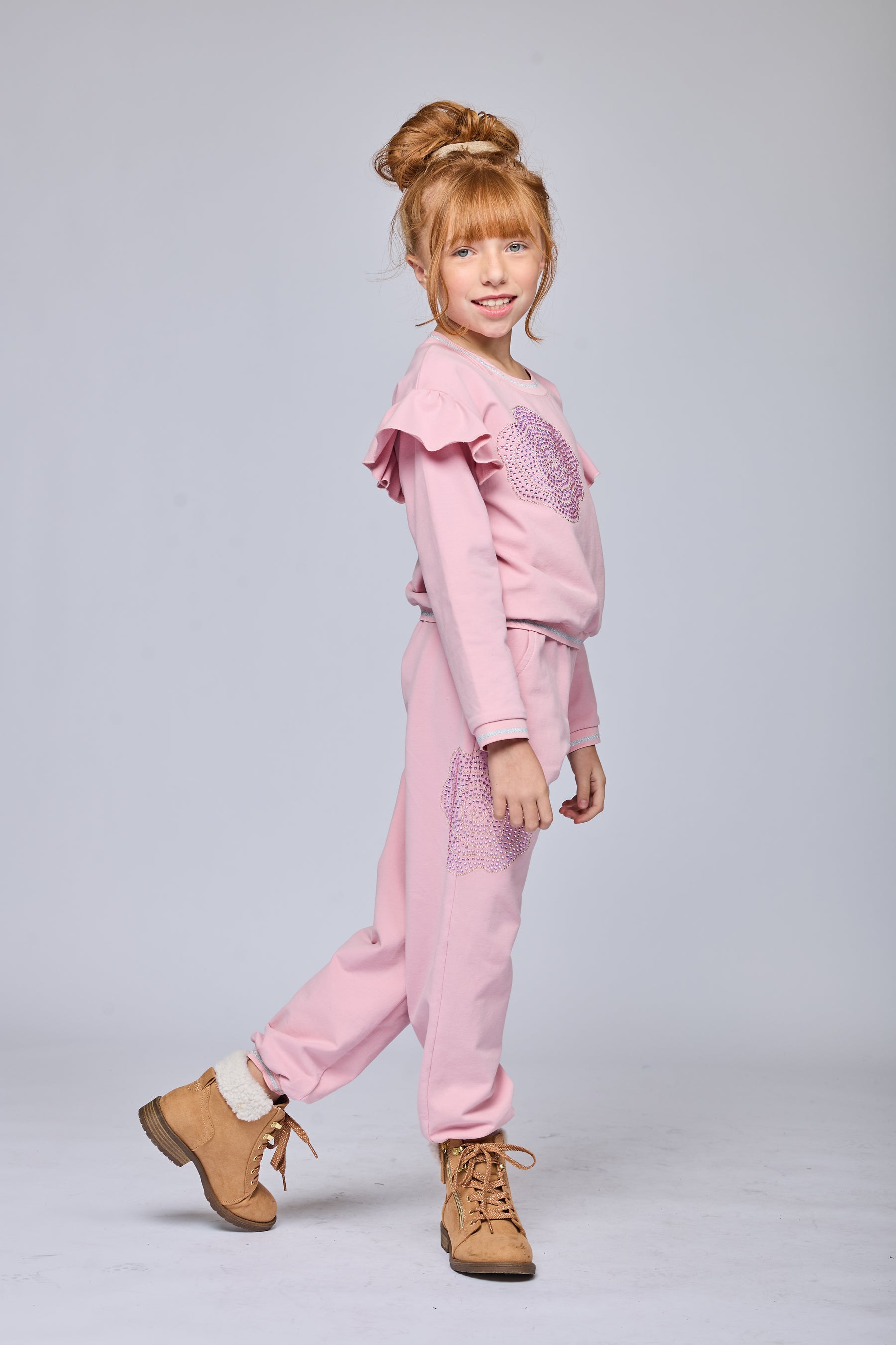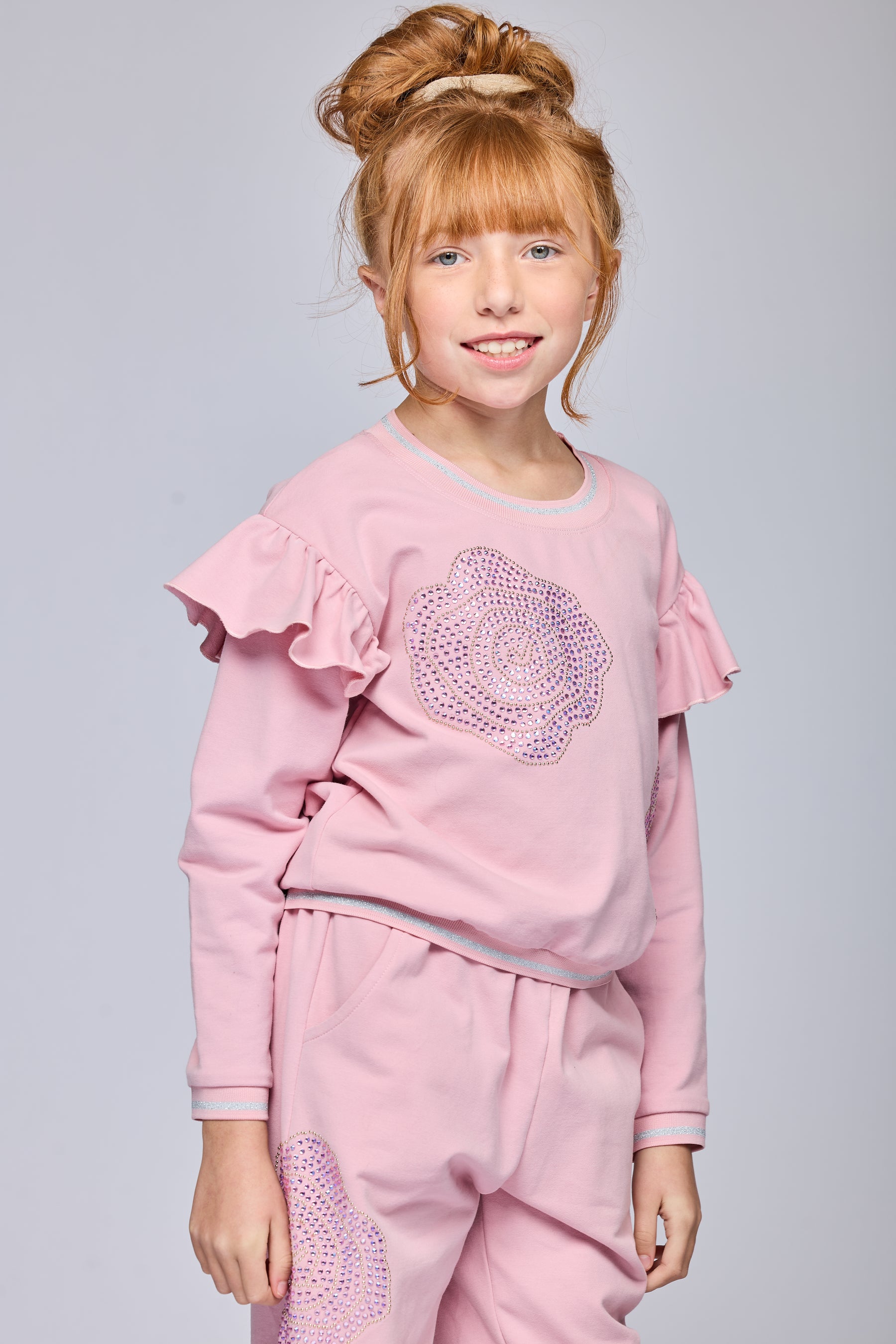 Elevate her everyday style with this adorable rhinestone rose sweatshirt featuring eye-catching shoulder ruffles. The sparkling rose design adds a touch of glamour, while the playful ruffle details bring movement and personality to every wear. Perfect for pairing with our matching rhinestone rose joggers (sold separately) to create a coordinated look she'll love. Soft, comfortable, and undeniably cute—this sweatshirt is a wardrobe essential for any young fashionista.