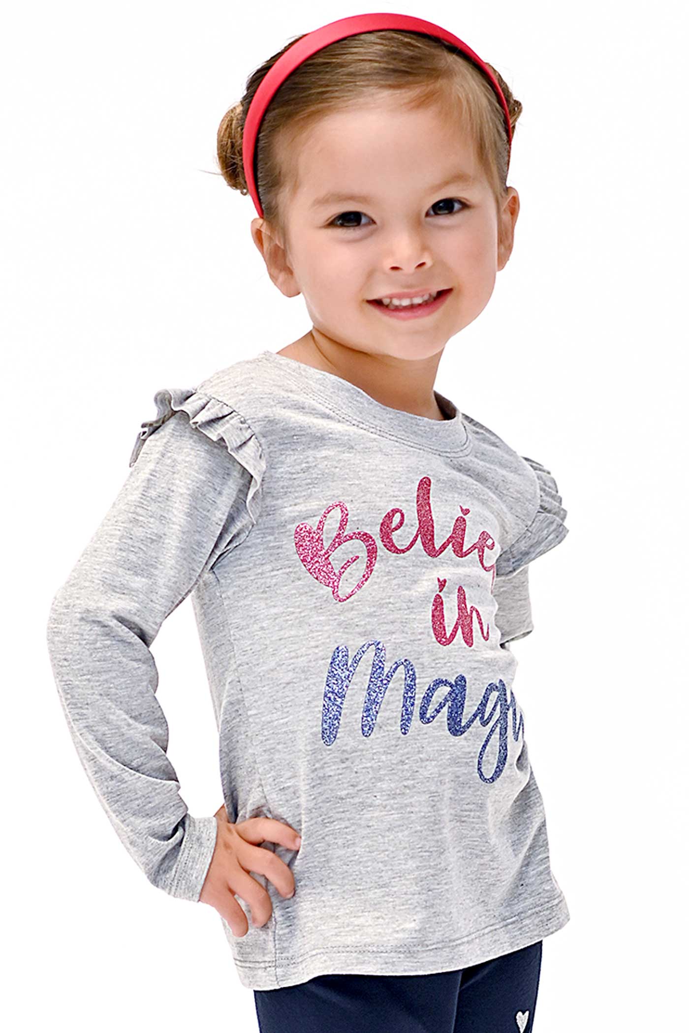 This playful long sleeve top features a round neckline and easy pull-on design for quick dressing. Made from soft, comfy knit fabric, it’s perfect for little girls who love a touch of magic. Adorned with charming frill details on the shoulders and a sparkling "Believe in Magic" glitter graphic, it’s an ideal choice for holiday fun and everyday wear. Imported for quality and style.