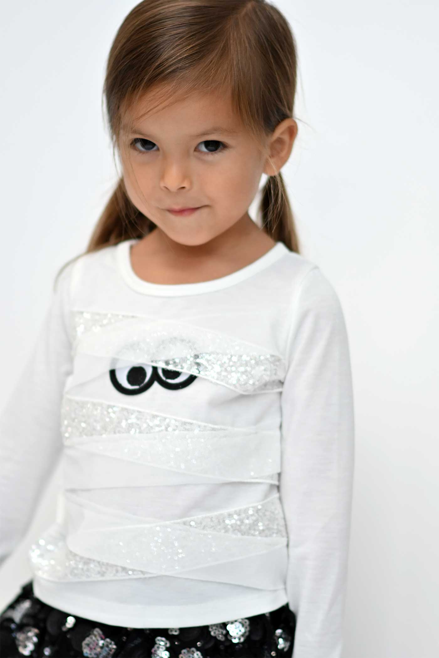 This playful long sleeve top features a round neckline and a super cute mummy motif adorned with googly eyes and sparkling sequin trim. Made from soft, comfy knit fabric, it’s perfect for keeping your little girl cozy while celebrating Halloween. Imported and ready to be her favorite festive gift!