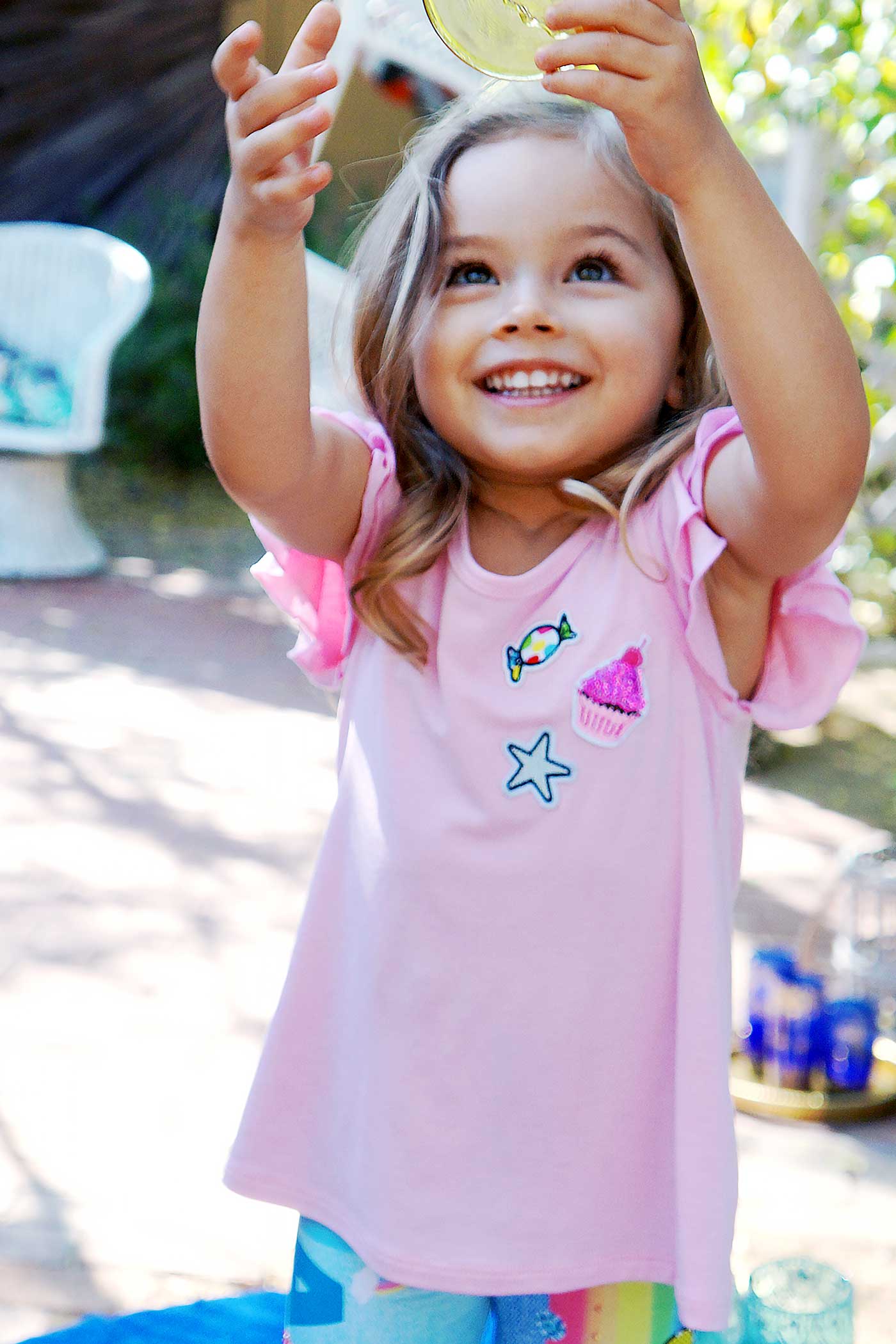 This toddler girls’ ruffle tunic top features a soft, comfy jersey fabric and a trendy cold-shoulder design that adds a fun twist. Playful appliques and ruffle short sleeves bring extra charm, while the tunic length covers the hip perfectly for pairing with leggings. Imported and made for little ones who love style and comfort!
