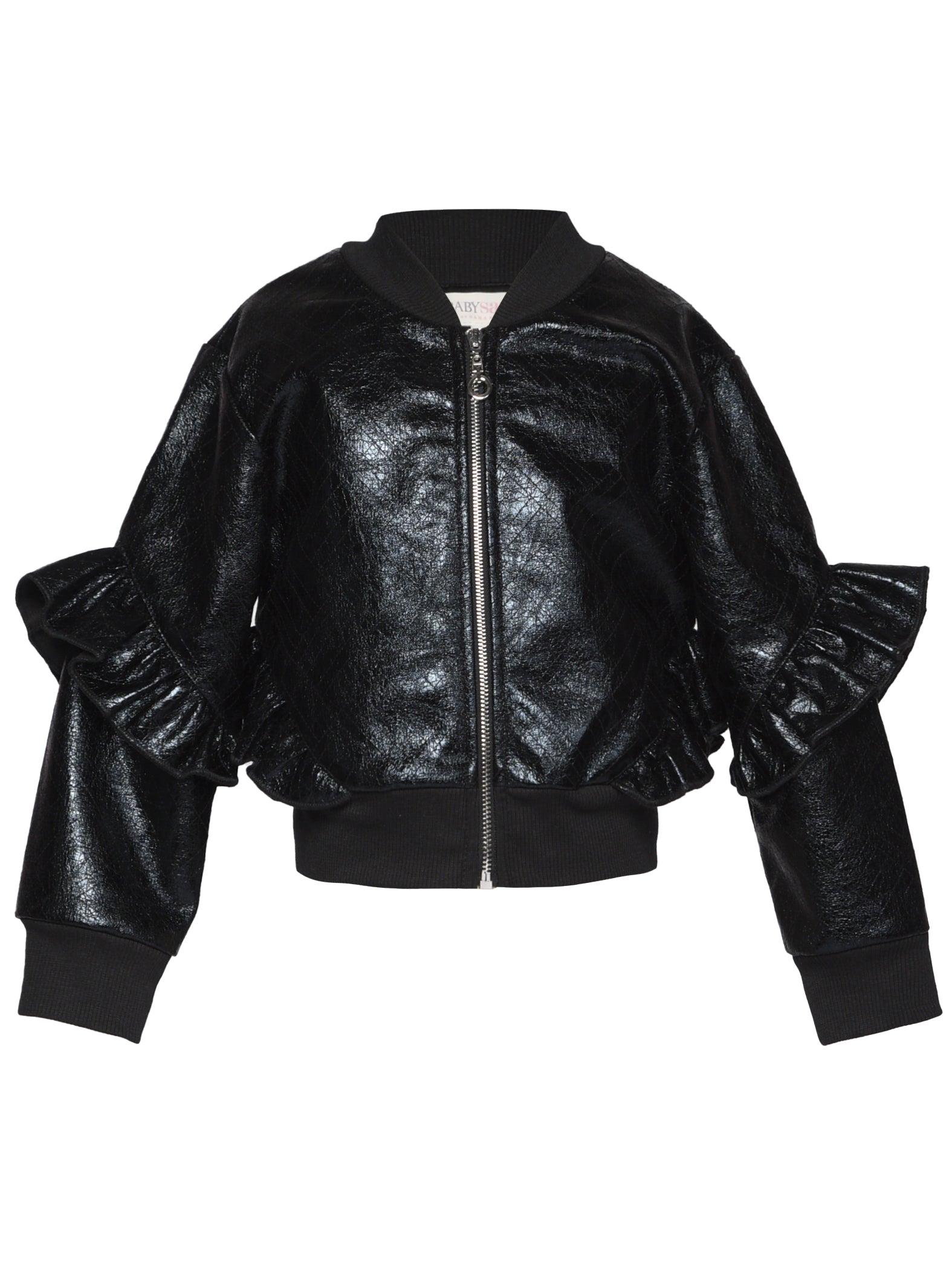 Elevate her wardrobe with this show-stopping faux leather ruffle bomber jacket! Featuring eye-catching ruffled details that add movement and personality, this jacket combines edgy style with playful flair. The soft faux leather construction keeps things comfortable while delivering that bold, fashion-forward look. Perfect for layering over dresses, tees, or hoodies, it's the ultimate statement piece for girls who love to stand out. Whether she's heading to school or a special occasion, this jacket brings instant cool-girl energy to any outfit.