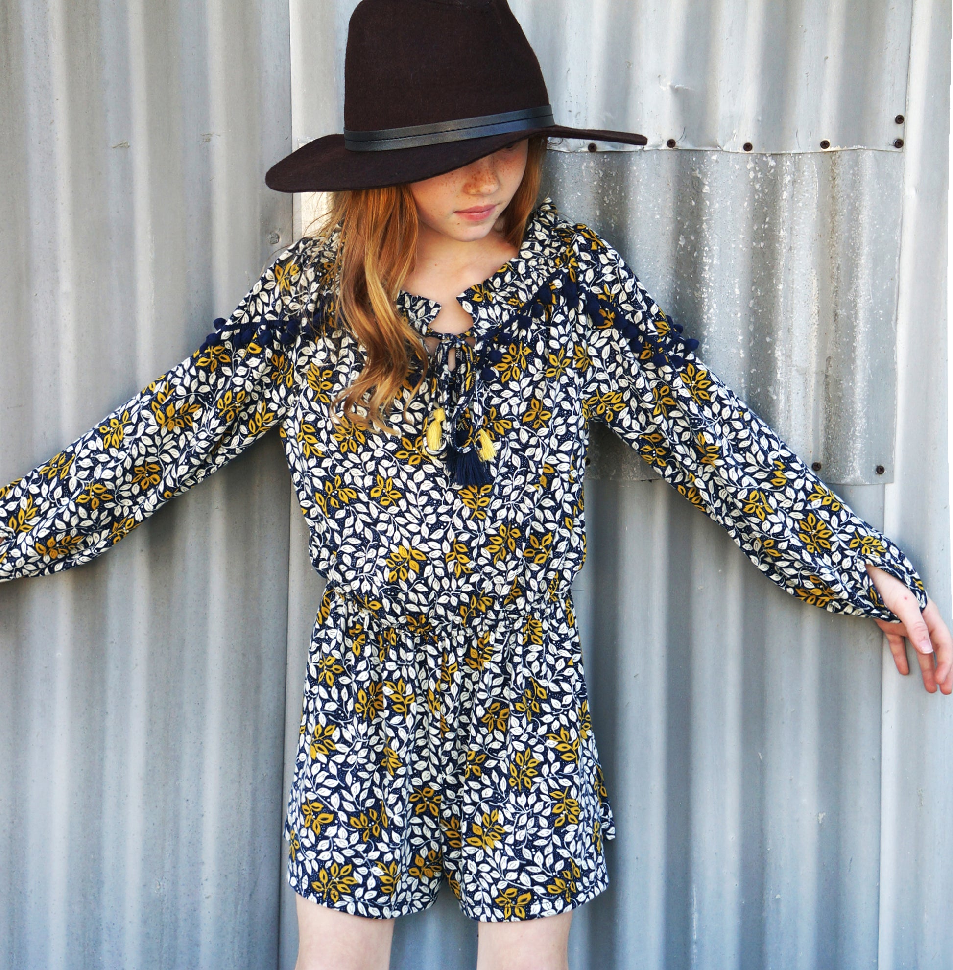 LONG SLEEVE ROMPER WITH COLOR TASSEL TRIM