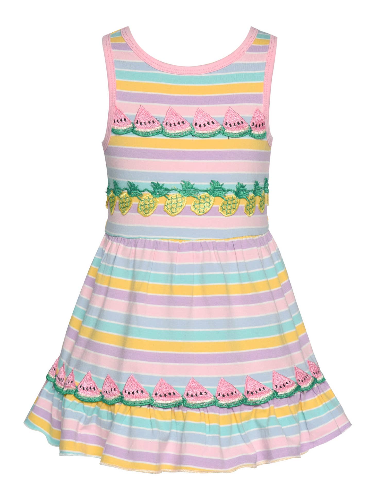 Make her day with this eye-catching Toddler Little Girl's Pastel Fruit Patch Ruffle Dress! Featuring adventurous watermelon & pineapple patches on this dress is sure to be a hit – shout out to the fruit of life-your little one! Add a dash of colorblock trim and stripes for a dreamy style that's as sweet as it is stylish. Who said fruit couldn't be fashionable?